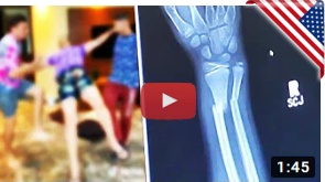 "a tradimento" viene sgambettata e spinta in avanti dai due "amici" cadendo